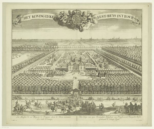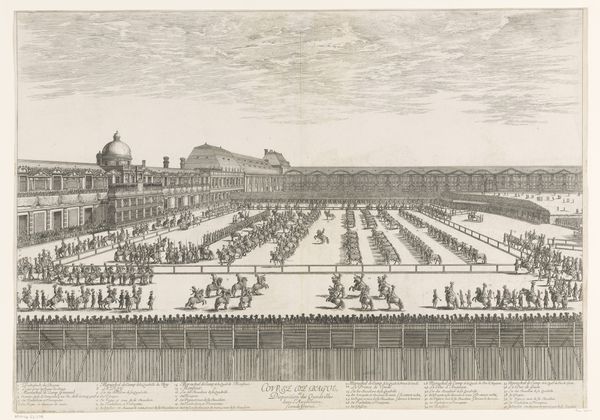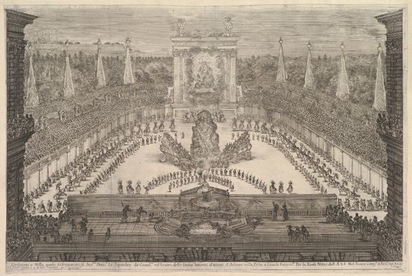 This print by Israel Silvestre captures a tournament in an amphitheater. The scene is dominated by the spectacle of a horse parade, a motif laden with historical and cultural significance. The horse, a symbol of power, nobility, and virility, has been central to the iconography of rulers and warriors for millennia, echoing in the equestrian statues of Roman emperors and Renaissance princes alike. Here, the animals are symbols of prestige and control, parading in what appears to be a reenactment of ancient battles. Consider how the equestrian motif appears not only in displays of prowess but also in emblems of peace and authority, adapted across time and cultures. It's as if this recurring image fulfills an archetypal need, a collective memory of strength and leadership that resonates on a subconscious level, evoking a feeling of awe in the spectator. The image of the tournament becomes a powerful reminder of the cyclical nature of history, where symbols resurface.