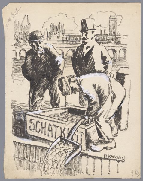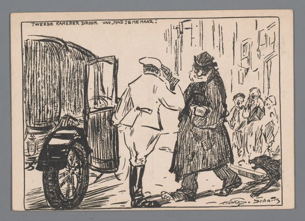 Curator: This drawing, titled "Predikant bij gevangene in cel," or "Preacher with prisoner in cell," made with ink sometime between 1900 and 1935, really throws the complexities of power and social structures into sharp relief, doesn't it? Editor: It definitely has a sardonic feel, almost like a political cartoon. What strikes me most is the disproportionate, caricatured figures and how they add to that mood. How do you interpret this work? Curator: It speaks volumes about the perceived hypocrisy within religious institutions and their relationship with social control. The preacher, puffed up and holding his book, alongside a guard, visits a slumped, clearly downtrodden prisoner. Consider who has the privilege of movement, of dictating the narrative? What kind of solace can the preacher actually provide in such a dehumanizing environment? Editor: I hadn’t considered that angle so explicitly, but now I see the preacher's visit as maybe less about genuine spiritual guidance and more about maintaining a specific social order. Like, almost a performance of morality? Curator: Exactly. And this begs the question, doesn't it? Who benefits from this performance? Is it about genuine reform or simply pacifying a restless population? Editor: It's a pretty bleak outlook, then, on the potential for actual change or empathy within such a system. It sounds like the work functions almost like a piece of social commentary. Curator: It really does. This work reminds us that art is, in many ways, a historical document that holds cultural contexts in high esteem; if not, at least reveals societal power structures during specific eras. Editor: I’m going to think a lot differently about caricature going forward! It’s really fascinating to see how it can be more than just a funny drawing. Curator: Indeed. Hopefully, by using interdisciplinary lenses of social and historical context to assess the themes it is more helpful for further interrogation.