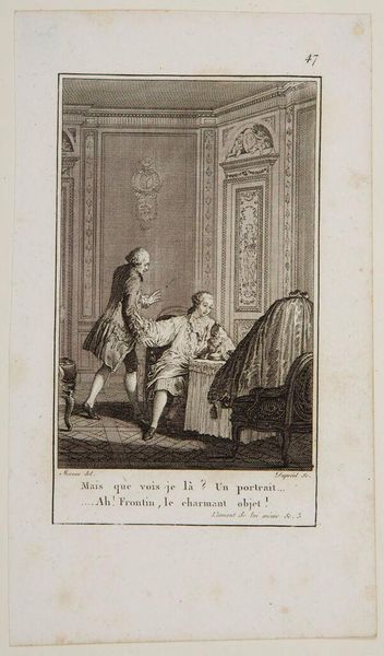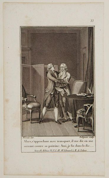 Curator: This is a print by Jean-Louis Delignon, a French artist who lived from 1755 to 1804. The piece is titled, "It's all over, I shall never see her again." Editor: The desaturated monochrome palette gives it a very serious, almost somber mood. The composition seems to emphasize the distance between the figures. Curator: Indeed. The print depicts a scene of separation. One figure, seated and holding what appears to be a letter, seems to confront another figure who is bent over in apparent despair. Editor: This piece speaks to the gendered dimensions of heartbreak and loss. The man's posture is striking—his body language almost embodies utter devastation. What social narratives might be at play here? Curator: The artist's focus on linear detail creates a sense of emotional intensity. The stark contrast between light and shadow further accentuates the drama. Editor: Ultimately, this intimate scene asks viewers to reckon with the personal, political, and social implications of broken relationships in eighteenth-century France. Curator: Quite so, Delignon really directs the viewer to focus on the essential elements of the scene to convey a sense of stark finality.