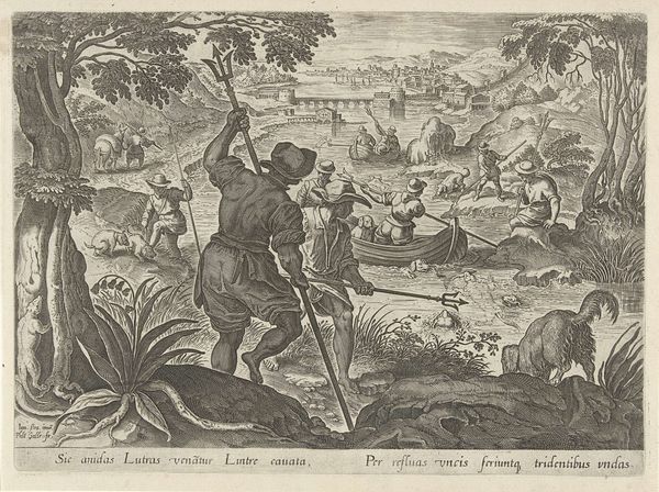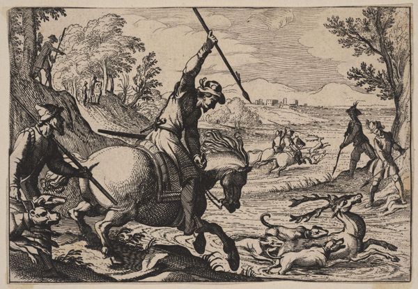 Editor: So, this is "Men on Horseback and Dogs Hunting a Stag in a River" by Antonio Tempesta. It’s a small engraving. It looks so dynamic for such a tiny piece; the lines really convey movement. What do you see in its composition? Curator: Indeed. Note how Tempesta uses linear perspective and orthogonal lines to create depth. The stag, dogs, and hunters form a series of diagonals, converging towards a vanishing point, thus creating a sense of recession into space. Editor: So, it’s not just the subject matter that creates the dynamism but the formal structure itself? Curator: Precisely. The artist manipulates form and space to imply action. Editor: I never considered that perspective could contribute to movement. Thank you! Curator: A pleasure. It is in analyzing the inherent properties of a work that we come to a better understanding.