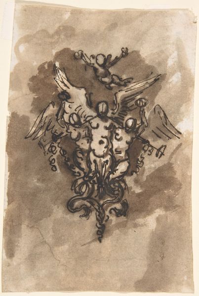 Editor: So, this is Giovanni Battista Foggini's "Design for a Console or Capital with a Cherub," made sometime between 1652 and 1725. It’s a drawing, perhaps also a print. There's something quite light and airy about the sketch, even a little unsettling considering it is Baroque. How do you interpret this work? Curator: It’s tempting to view cherubs simply as symbols of innocence, but in their historical context, especially within the Baroque period, they often served to reinforce social hierarchies and power structures. The design, intended for a console or capital, implies a support, a foundational element, almost as though these cherubs are bearing a weighty system above. How do you feel about that in terms of labor and its representation? Editor: I see your point. The cherub's placement does feel like a structural element, so that reading really complicates what the image is doing. It makes me think about the exploitation of innocence, the cherub forced to bear weight… Curator: Exactly! And considering Foggini’s patrons would have been from the aristocratic class, we have to consider whose stories are being centered and at whose expense. How might contemporary viewers challenge this representation, disrupt its intended reading? Editor: That’s fascinating. Maybe we can see it as an opportunity to reclaim and reimagine the cherub's role, to empower it, to rewrite a more equitable narrative for such figures who were historically disenfranchised. Curator: Precisely. It invites a dialogue about how we represent vulnerability and power, even within seemingly innocent artistic expressions. What a single drawing can open up for a broader discourse. Editor: I had never thought to question a cherub. It shows how much historical context matters!