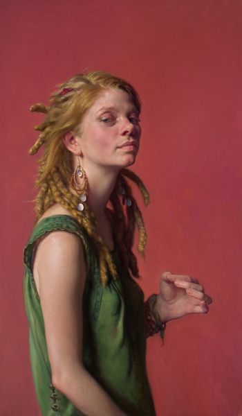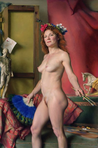 Curator: This is Nelson Shanks' "Harlequin" painted in 2007. Editor: Immediately, I'm struck by the dreamlike quality. It feels both theatrical and incredibly intimate. The lighting gives the subject this otherworldly glow. Curator: Yes, Shanks was a master of light. His portraiture is often described as luminous. And you pick up on the theatrical aspect; the Harlequin is, of course, a classic character from the commedia dell'arte. It’s playful, and it gives him license to explore performance and identity. Editor: Precisely! But it also suggests a reading on the expectations placed on women to perform, or mask themselves, behind an accepted role. Notice the peacock feathers held over her chest... they operate as adornment but also cleverly shield and hide at once. The woman becomes both spectacle and mystery. Curator: Absolutely. I'm curious how you read her gaze. Is it defiant, resigned, knowing? The lack of a direct address opens the work to so many interpretations. Her eyes are shadowed but also penetrating... it invites endless conversation and reflection. It almost feels like she holds a secret... Editor: A secret, yes, but one forged in complex negotiations of visibility. A secret tied, perhaps, to navigating identity in a world demanding constant performance. But, stepping back...it really captures a very fleeting, melancholy moment... a really pensive beauty on display. Curator: I completely agree. Its quietness speaks volumes, and that sense of melancholy lingers. For me, Shanks was always exploring the subtle emotional cues in his works, even in something as outwardly "theatrical" as this work. It's wonderful. Editor: Absolutely, and while anchored to traditions, I appreciate how this modern interpretation of such a classic figure sparks these ongoing, contemporary dialogues about representation. Curator: What a perfect way to think about a modern work of art finding conversations that transcend time. Editor: Precisely; these dialogues really highlight the ways classic ideas can inspire conversations about identity and the modern state of representation.