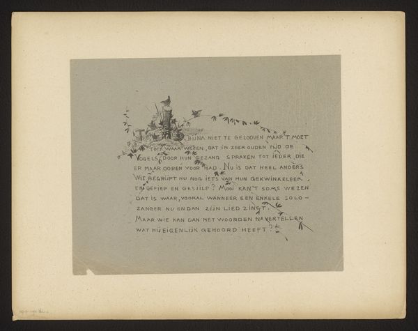 Curator: This is "Tekstblad met kieviten," or "Text Sheet with Lapwings," created in 1892 by Theo van Hoytema. It combines drawing and printmaking on paper, primarily using ink. Editor: My first thought is how haunting the image is. There is an understated beauty to the monochrome design, but it carries such heavy overtones with that lonely text block and stark birds. Curator: I appreciate that observation. Van Hoytema was very involved in the socio-political contexts of his time, even engaging with anarchist ideals and using art as social critique. It may be easy to overlook the piece as just an illustration of birds with accompanying text, but, within a particular cultural framework, this image becomes charged. Editor: Precisely. The inclusion of written text makes me think of issues of accessibility and communication, especially given the socio-economic contexts of the time and who the text actually speaks to, and for. The choice to make these lapwings so ominous seems to reinforce these sociopolitical tensions. They are flying, free in nature, but grounded by written word? It speaks to limitations and barriers... Curator: Indeed. Van Hoytema's work frequently engaged with themes of nature and freedom, but was equally influenced by emerging socialist and anarchist ideas in the Netherlands. These movements hoped to redefine concepts such as free expression, labor and even art. Editor: So even in his imagery we could assume an almost paradoxical, perhaps dialectical commentary on freedom – freedom in the image but perhaps, through our knowledge, a knowing limitation of those very themes and concepts. Curator: Yes, the work’s very public location within the Rijksmuseum brings with it an institutional endorsement that could not have been anticipated in Van Hoytema’s original moment of production. This is further magnified by the historical and continuing power structures around nature as an art form as we, as people in modern society, engage with ecological problems like habitat loss. Editor: Absolutely, understanding these dualities brings more depth to this piece of graphic art, which has surprising cultural impact in today's conversations around class and political action. Curator: By examining it, we see it isn't just a sheet with birds. The imagery is indicative of its place in socio-political movements that might otherwise go unseen today.