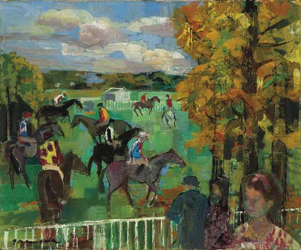 Maurice Prendergast created this watercolor painting, “Central Park”, which is now located at the Whitney Museum of American Art. The composition unfolds in horizontal layers: a fence in the foreground acts as a barrier, beyond which figures populate the scene in a frieze-like arrangement. Patches of color suggest both depth and surface, with dabs of paint coalescing into carriages, trees, and people. Notice how Prendergast employs a restricted palette, favoring muted greens, browns, and blues, with the occasional splash of red or orange to draw the eye. The loose brushwork and flattened perspective distances itself from academic realism. Instead, the artist is interested in the interplay of forms and colors on the picture plane. The structural elements—the fence, the rows of figures, the rhythmic repetition of shapes—create a sense of order, yet the spontaneity of the brushstrokes injects vitality into the scene. Consider how Prendergast uses watercolor, embracing its fluidity to evoke the dynamism of modern life. The painting serves as a visual record and prompts an investigation into the formal possibilities of the medium.