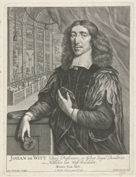 Curator: This compelling image is entitled "Portret van Johan de Witt," made using engraving techniques by Lambert Visscher between 1643 and 1690. Editor: The texture is remarkable; you can almost feel the weight of his robe. He looks like he carries burdens with him; it appears rather melancholic for a Baroque-style work. Curator: Indeed, there is a pensiveness. Johan de Witt was, of course, a prominent political figure, Grand Pensionary of the Dutch Republic. Visscher has depicted him within what seems to be the Binnenhof, the seat of the Dutch government. We're seeing the seat of power and this man seems somehow vulnerable. Editor: The backdrop seems to emphasize institutional power. His proximity and interaction with what appears to be a medallion seems deliberate too. He almost presents himself through a state lens while maintaining his distinct person. The dark attire seems quite somber, considering it’s within an elaborately designed backdrop. It projects a dichotomy. Curator: The contrast definitely evokes interesting discussion of how Johan de Witt is portrayed versus what the state or artist are trying to represent. This engraving allows us to see how visual strategies shape historical figures' personas in the public imagination. How does one begin to grapple with themes such as the patriarchy when we’re engaging with leaders through time and analyzing their position? It’s critical to remember the complex intersections between identity, gender, and political power as we interpret this portrait. Editor: Right, the portrait's purpose served not just documentation but a complex form of public image-making; Visscher captures the sitter amidst significant socio-political tensions. And within those constraints we’re given space to now examine these dynamics and have conversation around historical portraiture. Curator: Analyzing this baroque portrait provides significant insight into the man behind the power and into the politics of imagery of the time. Editor: Absolutely. A profound piece allowing us to reflect on power dynamics and its public representation through this one compelling personification.