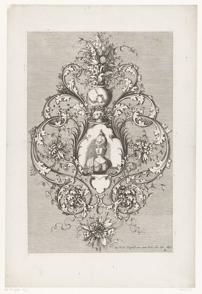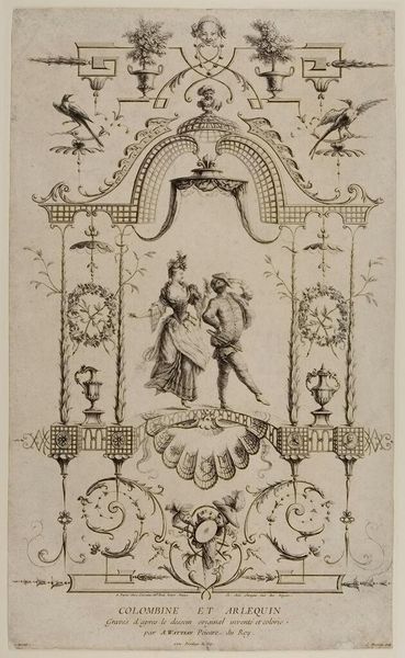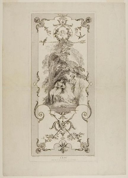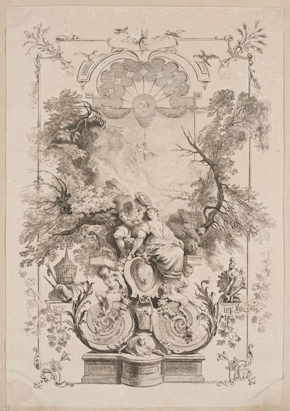 Editor: This is François Boucher's print, "Autumn." Its delicate lines and ornate framing create a sort of refined elegance. What compositional elements stand out to you? Curator: Note the meticulous balance: the central figures mirrored by decorative flourishes. The curvilinear forms—the embracing couple, the swirling foliage—create a rhythmic visual experience. Observe how the frame is integral, not just an addendum, enriching the central scene. Editor: So, the structure itself communicates meaning, beyond just the pastoral scene? Curator: Precisely. The very arrangement speaks to ideals of beauty, harmony, and a certain stylized grace characteristic of the era. The eye is never at rest, always drawn back into the intricate design. Editor: I see it now. It’s like the structure *is* the message. Curator: Indeed. Appreciating this work lies in deciphering its visual syntax.