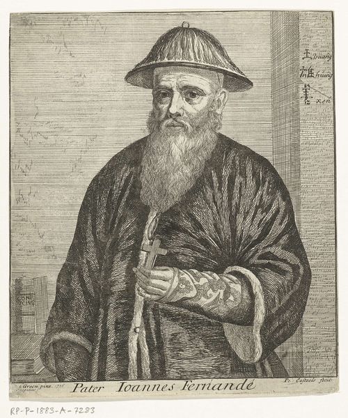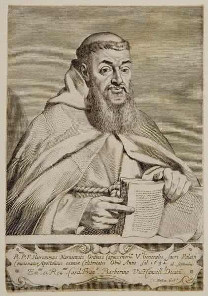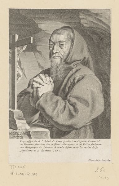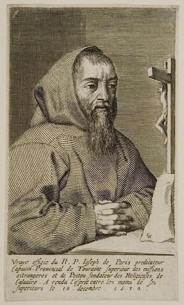 Editor: This is a striking engraving from 1638 by Claude Mellan. It's a portrait of François Le Clerc Du Tremblay, also known as Père Joseph. It's currently housed at The Met. I am fascinated by the intensity of the sitter's gaze and all those engraved lines that give a sense of texture. How do you read this piece? Curator: Ah, yes, a mesmerizing piece! It almost vibrates, doesn't it? To me, it's like looking through a keyhole into the 17th century. Père Joseph, or "Eminence Grise," the gray eminence, was a Capuchin friar and advisor to Cardinal Richelieu. Think of him as Richelieu's…right-hand monk. This engraving captures him in a moment of intense contemplation. What does the inclusion of the crucifix suggest to you? Editor: Perhaps it emphasizes his piety, his devotion to his faith? I see his hands are clasped, too, reinforcing that feeling of deep thought and religious dedication. Curator: Exactly. Mellan, through his masterful use of the burin, creates a powerful statement about Joseph's inner world and political influence, even though he wasn't *officially* in power. You almost get the sense he could see into your very soul! Don't you think the engraving, stark as it is, also shows him to be quite shrewd? Almost cunning, one might say. Editor: It’s fascinating how much character can be conveyed with such simple means. The intensity is palpable. Curator: Indeed! And consider the power of reproducible images at that time; imagine the circulation of this image throughout Europe, shaping perceptions and solidifying Joseph's persona. What a clever piece of propaganda if you ask me. I think that really stuck with me this time around. What about you? Editor: Definitely the way Mellan created depth and character from line alone. Gives me some goals for my own printmaking!