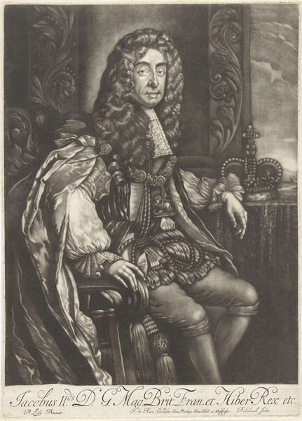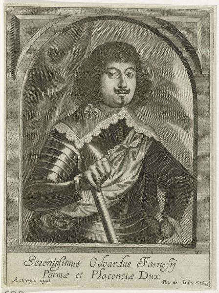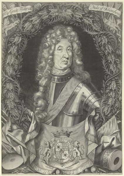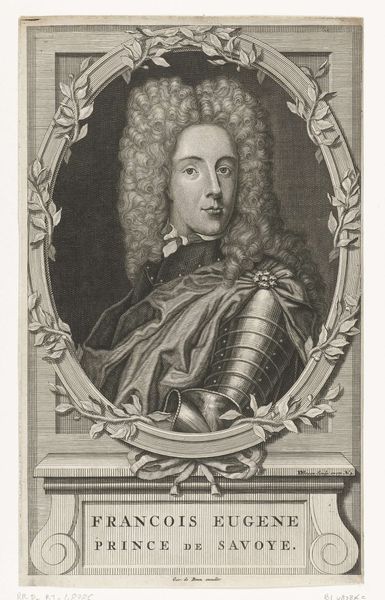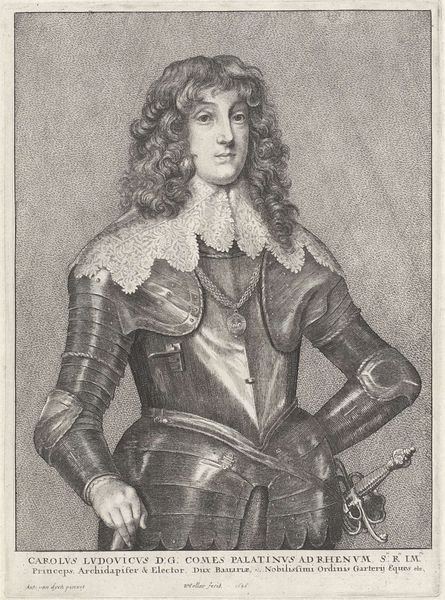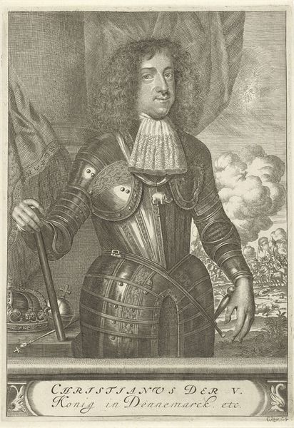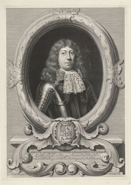 Curator: Before us we have an engraving of "Henrick Casimir Vorst van Nassau," crafted sometime between 1655 and 1700 by Jan van Somer. What strikes you first? Editor: The stark formality! It’s all so composed. The dark tones, the unwavering gaze, it radiates authority and… perhaps a hint of vulnerability. Curator: Indeed. Van Somer positions him in a way that merges earthly power—suggested by the armor—with intellectual prowess; notice the background architecture signifying governance and education. Editor: I'm intrigued by the meticulous details of the armor. The texture achieved through engraving is captivating, each tiny dot contributing to the overall impression of metallic weight and surface complexity. Curator: That's characteristic of baroque portraiture, to project a powerful image, blending the person with the symbolic weight of office and family. Editor: Is that his helmet there to the left? Resting almost like a discarded burden? Does it hint at peace following a war? Or perhaps the availability of readiness? The column behind him, with the mountainous scene in the distance is also quite intriguing. Curator: Symbolically speaking, his attire isn't merely for protection; it mirrors classical heroes and the perceived justness of their rule, evoking historical strength and moral authority. It invites a reading of leadership. Editor: The play of light and shadow creates a strong visual narrative, but what kind of narrative exactly? Is it meant to inspire awe? Is it subtly humanizing? What’s behind that almost melancholy expression? Curator: Portraits from that period were rarely simple reflections. Consider that those in power would have sought associations with a kind of classical glory. This also has that slightly melancholic quality so favored at the time, adding depth to an otherwise imposing figure. It shows not just a ruler but a man contemplating leadership and history. Editor: A powerful interplay of artifice and emotion. A display of might tempered by a shadow of… contemplation? An elegant work that still manages to provoke thought centuries later. Curator: A beautiful example of how formal portraiture captures and transmits specific values that persist to this day.