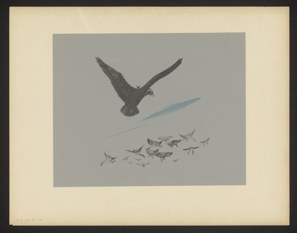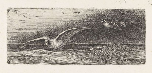 H.P. Hansen made this illustration for "Makreldorg" with engraving techniques, now held at the SMK. It depicts birds flying above a stormy sea, capturing a moment of natural drama. Made in Denmark, we can consider the cultural context that the artwork inhabits. Denmark's long maritime history shapes its cultural identity; it’s possible that Hansen sought to capture the spirit of Nordic exploration. The piece invites us to reflect on Denmark’s relationship with the sea, and the ways in which it is represented by the institutional structures of the time. To fully appreciate the print, we can consult resources like the artist's biography and the socio-economic conditions in Denmark at the time. The meaning of art is contingent on its social and institutional context.