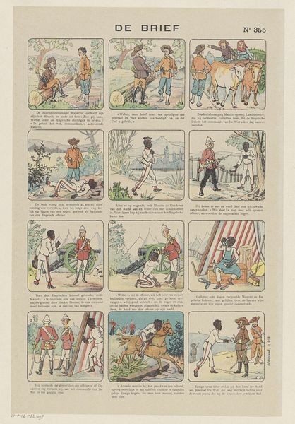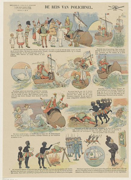 Curator: This is "Coco, de goede aap," or "Coco, the good ape," a print dating from around 1902, made by an artist known as Camouche. Editor: It looks like an early comic strip! Each scene feels like a little snapshot, playful and bright despite some questionable imagery, it gives me a kind of wistful feeling. Curator: Considering the materiality, this print would have been produced for mass consumption, a reflection of the increasing accessibility of visual narratives at the turn of the century. The artist's labor and the printing process itself become part of the artwork's story, reaching a wider audience than a traditional painting might. Editor: It certainly tells a story. You see Coco, who appears to be an indigenous person referred to as an "ape," interacting with a European sailor, often in scenarios that seem…well, complicated by colonial power dynamics. It's hard to ignore those societal implications shaping the art. Curator: Precisely. We can consider how such images reinforced social hierarchies. These works were commonly found in public spaces, influencing attitudes and potentially perpetuating stereotypes. Think about the politics of visual representation here, the role it played in shaping perceptions of otherness. Editor: I wonder about Camouche's intent, though. Was it simply reflective of prevailing views, or did the artist have any critical perspective? Regardless, its role as an artefact speaks to the complex, often troubling history embedded in popular imagery. The very process of printing these and their circulation adds layers to this narrative. Curator: Absolutely, these aren't just illustrations, they're social documents. Examining them lets us analyze how colonial power infiltrated even seemingly innocent forms of entertainment. Editor: Seeing this brings the impact of social narratives through artistic expression sharply into focus, no matter how subtly crafted. Curator: For me, seeing art as labor helps in looking beyond aesthetics, urging a discussion around production, the dissemination of ideas, and the hands that shape them.