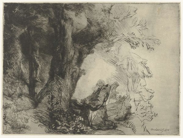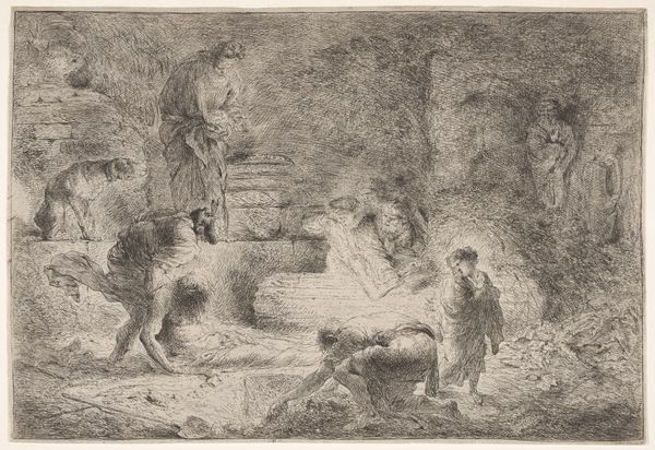 Editor: We’re looking at “Donkey Upset by Storm,” an etching by Alphonse Legros. The distressed figures really strike me. What compositional elements do you notice that contribute to the drama? Curator: Observe how Legros masterfully employs line. Notice the chaotic hatching in the sky mimicking a turbulent storm, which contrasts starkly with the relative calm of the earth beneath. It's this tension, this visual dichotomy, that animates the scene. Do you see how the figures lean, almost collapsing, into the storm's force? Editor: Yes, the diagonal lines really emphasize that sense of collapse and vulnerability. How does that affect our interpretation of the subject matter? Curator: The strategic use of line guides our eye, creating movement and rhythm within the frame. The donkey, grounded and supine, serves as a visual anchor amidst the surrounding chaos. The woman flailing against the winds is positioned adjacent to the tree, while the man bows over the downed donkey. Does that give the image more visual weight? Editor: Absolutely, it's like he is at the center. Curator: Furthermore, consider the tonal variations Legros achieves through etching. The stark contrast between light and shadow amplifies the drama, heightening the sense of unease and imminent danger. It's the artist’s emphasis of light breaking through heavy sky using horizontal versus dynamic diagonal markings which drives the picture. It almost looks like there are spotlights on the humans. Editor: It’s interesting to focus solely on these elements; the etching marks and dramatic forms overshadow any potential narrative, and they are captivating. Curator: Precisely! It’s the power of pure form, where the artwork transcends mere representation to evoke a visceral response in the viewer.
