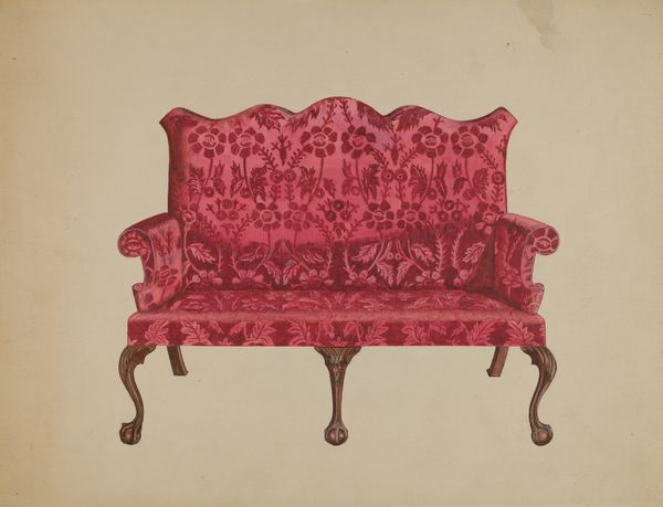 Curator: Immediately, it strikes me as embodying bourgeois comfort, that plush red and ornate carving suggesting an invitation to relax within strict aesthetic parameters. Editor: That's a perceptive reading. Let me introduce Henry Moran's "Settee (Eagle)", dating from around 1940. It’s rendered with watercolor and drawing techniques. This work offers a unique vantage point for discussing notions of taste, class, and gender. Curator: You're right. Considering the era, could this rendering perhaps speak to a very specific performativity of domestic space, where furniture acted as a silent script defining social roles? That shade of red itself seems loaded with meaning, perhaps signalling a controlled passion. Editor: Absolutely, one can delve deeper into how the tufted upholstery might represent both containment and accessibility within domestic confines. Moreover, the rigid symmetry and formal presentation imply an aspirational positioning, the object presented in its full glory to communicate ideals. Curator: It also invites us to consider the labor and cultural values embedded within such design and aesthetic choices—the skilled craftsmanship demanded by such forms, the access necessary to attain the item it portrays. The ‘eagle’ motif particularly demands unpacking. It represents freedom, power, but when placed within this domestic setting, it possibly hints at a very controlled assertion. Editor: Agreed, a controlled freedom expressed through artistic components, and aesthetically, the color contrasts against the bare background allow an interesting figure-ground relationship that drives the eye and really highlights Moran's precise drawing and brushstroke skill. There is, however, little to challenge our immediate perceptions about social convention in its artistic expression. Curator: Exactly, that lack of overt subversion makes it fascinating as a social document— it encapsulates a historical moment while simultaneously reifying it. Editor: And in its artistry, Moran provides a striking piece open to many potential philosophical, historical and aesthetic insights. Curator: A remarkable encapsulation—an eagle brought down from the sky and perched on a plush settee. Food for much contemplation about cultural constraints and class performances, even today.