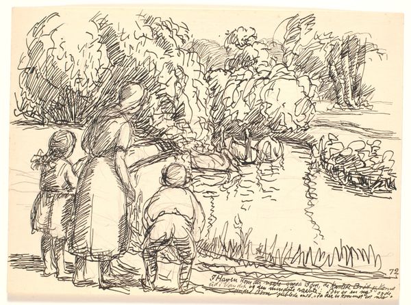 Curator: Carl Larsson's "Breakfast under the Big Birch," created in 1895, offers a glimpse into the artist’s family life, a theme recurrent in his oeuvre. Editor: It has such an intimate, candid feel, doesn't it? There's a wonderful lightness to it—the casual composition, the soft watercolors. It speaks of warmth and a sort of nostalgic tranquility. Curator: Larsson, as a prominent figure in the Arts and Crafts movement, deliberately challenged the academic art of his time, choosing everyday scenes. What tools did he use to shape these materials into artwork and what were his working conditions like, particularly as the genre he was using was linked to illustration? Editor: Absolutely. Considering the family, the artwork, and social life are fused in his practice, we could also ask ourselves about gender roles during this time period in a very gendered society. We could view this not merely as an idealized domestic scene, but as a snapshot of bourgeois aspirations, the labor often invisibilized to maintain this vision of idyllic harmony. The serving, the constant nurturing— these roles often disproportionately falling on women to maintain social power balance. Curator: And this painting technique too, this light, quick method, lends itself well to mass production as well! Editor: Precisely! Its accessibility becomes a statement. Rather than being confined to galleries, it becomes domestic decoration, a form of accessible and easily consumed art with social power. Curator: He was very intentional about the distribution of his work as postcards or illustrations. This piece certainly highlights Larsson's savvy approach to integrating art and life, production and personal expression. It gives one quite a bit to think about, no? Editor: Indeed. Considering how it blurs the lines between intimate life and commodity reveals interesting social contexts around artistic production and audience reception even to this day. It offers an invitation to critique broader societal trends embedded in representations of domestic bliss.