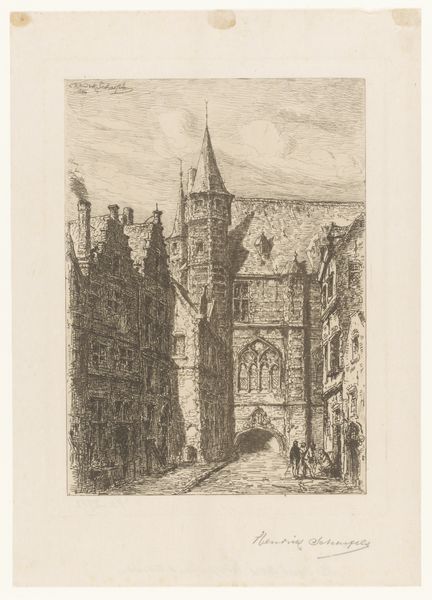 Editor: Here we have Isaac Weissenbruch's "Water- of Gevangenpoort te Woudrichem," created sometime between 1836 and 1912, using etching and ink. It strikes me as quite a detailed cityscape, capturing everyday life. What historical elements do you see at play here? Curator: It’s fascinating to consider the sociopolitical forces shaping this seemingly simple scene. Notice how the gate dominates the composition. These city gates, the Gevangenpoort, originally had a clear function - control, defense, the regulation of commerce. The art becomes a way to remember their initial reason to exist. How does the way the artist portrayed it comment on its societal role at the time, during this transition period in Dutch history? Editor: It feels more like a picturesque scene than a fortress. The people casually strolling through seem almost indifferent to the gate's imposing structure. Curator: Precisely! This subtle subversion is key. Weissenbruch wasn’t simply depicting architecture; he was portraying its evolution within the public's perception. Do you think that romanticizing these previously military urban features made art more relevant at the time? Editor: I suppose showing the gate as an accepted monument might make citizens more keen on the changes of society. It’s incredible how much historical context is embedded in this etching. Curator: Indeed, by studying the seemingly mundane, we reveal powerful statements about the ever-evolving function of urban spaces and their cultural resonance. Editor: I will now view cityscapes in a whole new way!