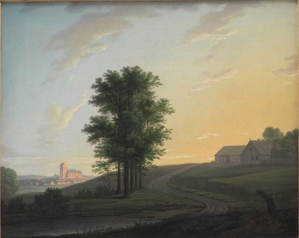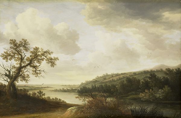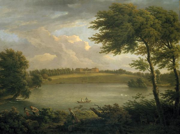 Curator: This watercolor painting, "Landscape with Fisherman and Washerwoman," was completed around 1790-1800 by John Rathbone. It exemplifies English landscape painting of the period. Editor: It's deceptively simple, isn't it? A serene, pastoral scene, but with a subtly melancholic mood. I'm drawn to the quiet diligence depicted in the figures as much as I’m interested in how it’s made. The transparency of the washes build up into heavier, saturated forms where human activity is registered. Curator: Indeed. Water itself has symbolic resonance—here, as a connector. Rathbone masterfully uses watercolor to create a sense of atmospheric depth and tranquility that evokes emotional and spiritual ideas. Editor: But the laborers are the foundation of this tranquility; note their positions in the lower register—both in deep, close proximity with the land. Watercolor enabled a fast, efficient registration of work enacted in, with, and for the landscape. Look at that clear division of labour in the figures! Is he providing while she maintains? Is this an imagined projection onto English society and gender roles in the period? Curator: That’s a fascinating way to look at it! I’d also suggest, consider the overarching themes of harmony and order within the landscape. Even these little genre scenes carry that larger idealized picture of life. Editor: But “harmony and order” is a kind of labor, right? These idylls elide the dirty material work and processes from view to the viewer. Consider this choice in relationship to paintings by J. M. W. Turner, some years later, which emphasized sublime industry. Curator: An important counterpoint. We must remember that landscape is not only a reflection of nature, but also a constructed image carrying loaded values and cultural meanings of the time. Editor: That tension, I think, makes "Landscape with Fisherman and Washerwoman" far more complex than its unassuming appearance initially suggests. It is a materialized vision but not of the natural world, I suspect. Curator: An image made manifest of the early days of English Romanticism with many intriguing facets, reflecting an enduring tension between the ideal and the real. Editor: It shows how materials can conceal and reveal both individual experience and broader social realities within even the seemingly most straightforward of landscape paintings.