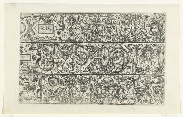 Curator: Look at the intricacy! Here we have "Een breed fries en twee smalle friezen met moresken," dating from between 1550 and 1580, held here at the Rijksmuseum. It's an engraving. Editor: It has such a decorative quality, almost overwhelming. A feast for the eyes. I see immediately a dense, interlacing design, repeated motifs – the lines so clean, like an ornamental script, but cold. Curator: The cool effect comes through, indeed. I understand this piece speaks volumes about the accessibility of art during that period. Engravings allowed for mass production, democratizing visual culture beyond the elite. Imagine these borders not just as adornments, but as tools for social climbing through fashionable displays! Editor: Absolutely. And we can't ignore the labor involved in producing such a print. Who were these artisans? Were they celebrated or considered mere craftsmen? Their skills were undeniably crucial to spreading design ideas and contributing to interior decoration. We would want to reflect on what printmaking afforded society. Curator: Excellent questions. It makes you think about who was designing these things, right? Were they even attributed in many instances? We know prints like these circulated widely as models for artisans, influencing everything from furniture to textiles. It played a critical role in establishing aesthetic standards and spreading Italian Renaissance ideals across Europe, it should also be noted. Editor: Yes, and the 'moresken', or moresque designs are themselves fascinating—borrowed and adapted from Islamic art, reflecting a complex cultural exchange and appropriation that often gets glossed over. We see the dynamics of power playing out even in these decorative forms, right? What does it mean when Western art adapts motifs rooted in another culture’s aesthetics? Curator: Precisely! These objects invite viewers to reconsider notions of authorship and value—how these images helped transform taste and aspiration among a growing middle class hungry for symbols of status in their domestic environments. Editor: So, it is fair to state that despite its detached affect and cold style, this piece has a dynamic history of production, and cultural adoption tied to larger historical shifts in economy and power! Curator: Right. It’s an intersection where aesthetic preferences collide with social ambitions. Editor: Which makes it all the more worthy of exploration, beyond its initial appeal as ornament.