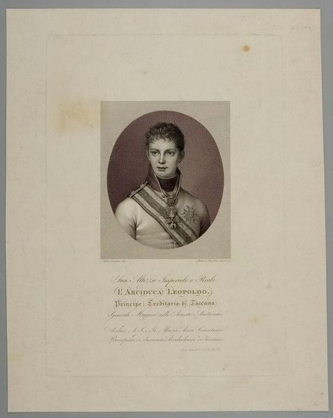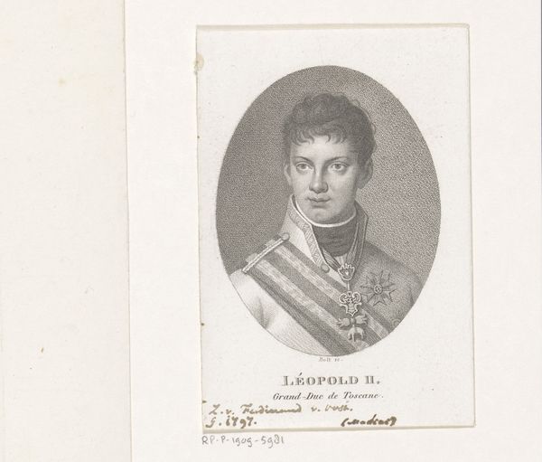 Curator: I'm drawn to the almost melancholic air surrounding this portrait. There's a delicacy in the rendering that softens what could easily have been a very rigid, formal image. Editor: Yes, that reserved sensibility speaks volumes, doesn't it? This is Carl Mayer’s 1842 engraving of Frans van Assisi van Bourbon, consort to Queen Isabella II of Spain. Here on display at the Rijksmuseum. A potent symbol, though perhaps of constrained power. Curator: Precisely. Notice how the artist uses the intricate detail of his military uniform, all the ribbons and medals, to define the weight of duty and responsibility. Yet his expression suggests something different. There's an inner world that those symbols are barely containing. Editor: Power can be so performative. I wonder what this image signified at a moment of rising democratic movements in Europe? An emblem of dynastic continuity perhaps, a longing for tradition amidst revolutionary change. And notice too who he married, or rather who married him; the Queen in Spain. Curator: Symbols layered upon symbols. This image also evokes a return to classicism. The idealization of the face, that careful attention to light and shadow… it almost elevates him beyond the personal, turning him into an archetype. There is also a certain sense of vulnerability depicted, especially in his gaze. What do you read in that gaze? Editor: Perhaps awareness. This is a posed presentation. Here is a historical person, sure. And while historical portraits can shape legacy, they reflect a performance. And given the complicated circumstances of Frans' marriage and role, what are we supposed to see or ignore in his gaze? What of the political theater, then as now? Curator: A complex narrative contained in a seemingly simple image. It encourages us to look beyond the surface, doesn't it, to the inner world and the cultural forces at play. Editor: Indeed, by excavating these historical layers and confronting social and historical power dynamics, images like these cease to be mere likenesses. They offer invaluable reflections on power, performance, and persistent human struggle.