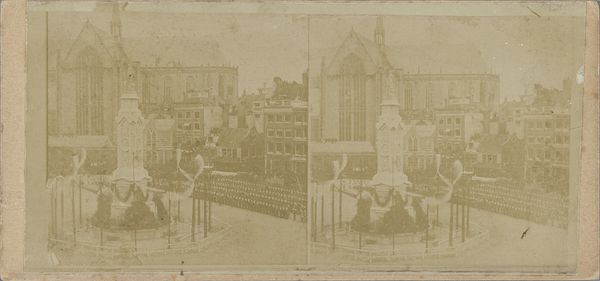 Curator: What a stillness captured here. It almost feels… sepulchral, yet majestic. The Nieuwe Kerk dominates the Dam Square in Amsterdam. This albumen print, dating from 1859, is the work of Pieter Oosterhuis. Editor: It certainly does have a muted quality, a quiet grandeur. The near monochrome palette lends it a sense of timelessness, despite being so clearly rooted in a specific moment. Curator: Right? It’s fascinating how Oosterhuis used the new medium of photography to document such an established scene. You have the very modern technique used to capture the eternal symbol of the church. Note the light, almost a ghostly glow, as if memory itself is imprinting the scene. Editor: Yes, there's a kind of stark realism in the architectural details, balanced with the slightly faded quality of the albumen print that softens the scene, almost rendering it like a dream. The way the building looms, it’s like Oosterhuis wasn't simply taking a snapshot, but constructing a powerful image. The Nieuwe Kerk takes on symbolic meaning: spiritual tradition dominating the landscape. Curator: Maybe even overshadowing it? It’s interesting that he doesn't really show the bustle you might expect from a city square. Instead, it's like he’s captured the soul of Amsterdam in stone. I like how those empty streets amplify this notion of an all seeing building watching a soul slowly leaving its earthly body Editor: Good point, he isn't presenting it as a hub of commerce, but a symbolic anchor. One might see the rigid geometric forms and precise composition as reflections of religious and social order and its structures of power and control that extend into our world. This is a potent piece in capturing cultural memory and conveying powerful meaning. Curator: And for me, looking at it now, that’s its real power – how something frozen in time can continue to provoke fresh interpretations and evoke such resonant moods. Editor: It does leave one contemplating how buildings speak across the ages. Fascinating, indeed.