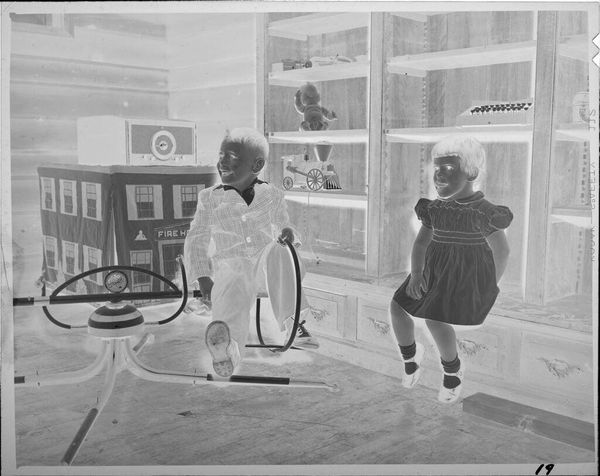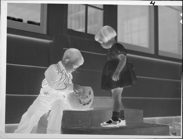 Curator: This photograph, of indeterminate date, by Lucian and Mary Brown, is titled "Untitled (boy and girl with jack-o-lantern)." It's a small piece, only about 3 by 4 inches. The children are positioned around a grinning jack-o-lantern. Editor: It strikes me as a study in childhood rituals. The pumpkin, of course, is a potent symbol of Halloween, but also of harvest and home. Curator: Yes, the iconography certainly evokes seasonal traditions. But I'm equally interested in how this image would have circulated within their family and community. The photographic process itself, and the display of such images, were social acts. Editor: Indeed. These images acted as memory keepers, preserving not only the look of the children but also the feelings associated with the holiday and their relationship to it. The jack-o-lantern's face, even now, feels somewhat ominous. Curator: Perhaps, but remember, in a pre-internet era, representations like these shaped societal understandings of holidays. The visual narrative of Halloween was actively being constructed and negotiated. Editor: A poignant reminder that even the most innocent-seeming images participate in broader cultural narratives. Curator: Absolutely.