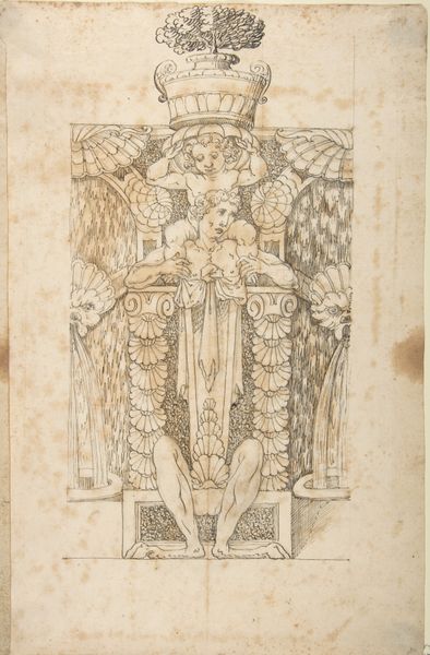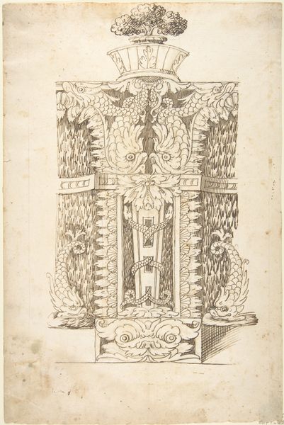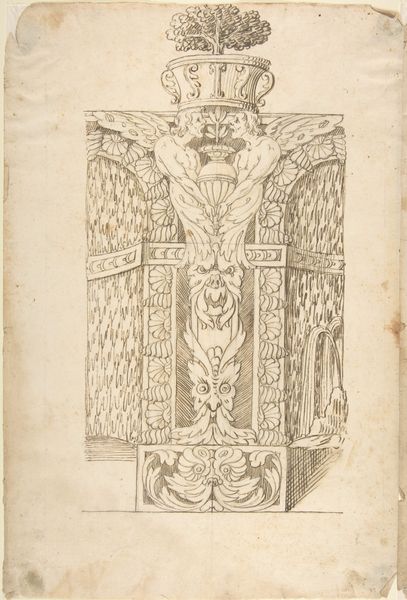 Curator: What a marvelously ornate design! This is an ink and pen drawing entitled "Design for a Wall Fountain," dating from somewhere between 1550 and 1620, a high point of the Italian Renaissance. It’s currently housed at the Metropolitan Museum of Art. Editor: It has such a peculiar vibe, a beautiful fever dream. I mean, centaurs frolicking above lions, gargoyle faces, and cascading…water, I presume? It’s all so extravagantly imagined! Curator: Indeed! This drawing offers insight into the artistic tastes of the Italian Renaissance, revealing their love for allegory and figuration. The fountain isn't just a practical object; it's a canvas for representing powerful narratives and philosophical ideas. Think of fountains as the social media of their time! They publicly proclaimed values and social standing. Editor: The line work is fascinating too. See how delicate and precise it is, yet it evokes such a sense of movement, especially in the implied water. The composition itself feels theatrical, almost as if a stage set has sprung to life. Does the symmetry also evoke a particular kind of Renaissance ideal? Curator: Precisely. The symmetry is deliberate, echoing the classical ideals that Renaissance artists so admired. But the inclusion of mythical creatures, like those playful centaurs, also gives a nod to secular themes creeping into the visual landscape of the time. Editor: There's a definite sense of abundance and excess, which is intriguing, knowing that such displays were meant for public consumption and social differentiation. The level of craftsmanship indicates that its patron was indeed someone affluent and discerning. What’s also so special, is that we’re seeing not the result, the actual fountain, but the initial fantasy that existed only in the artist’s mind! Curator: Exactly! In this one drawing we glimpse a confluence of artistic trends, technological innovations in hydraulics, social practices surrounding courtly life, and philosophical preoccupations. Editor: Looking at the drawing, I find myself longing for such unbridled artistry in public spaces today! It's more than just decoration, it's about fostering cultural identity through art. Curator: I concur! The beauty of history allows us to hold a dialogue across eras with the help of these Renaissance imaginations.