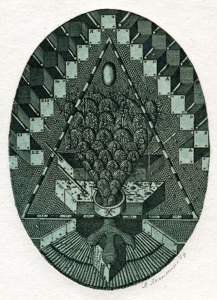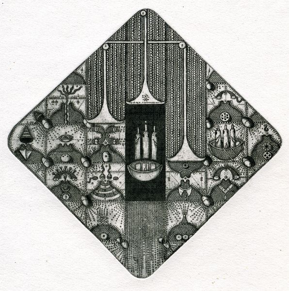 Editor: Here we have Oleksandr Aksinin’s “PostA” from 1984, an etching and engraving on paper resembling a postage stamp. It’s incredibly detailed, almost overwhelming, and has this fantastical, surreal feel to it. What stands out to you about this piece? Curator: Considering the intricate etching process and its stamp-like format, it’s crucial to acknowledge this work as both high art and a commentary on the means of distribution. How does the traditional, painstaking method of etching contrast with the mass-produced nature of a stamp, typically an inexpensive and utilitarian object? Editor: That’s an interesting point. It’s like he’s elevating something ordinary to the level of art through the sheer labor involved. The stamp form itself becomes a statement about value. Curator: Precisely. Also, consider Aksinin working within the context of Soviet Ukraine in 1984. Access to materials and artistic freedom would have been significantly restricted. The very act of creating such a detailed and symbolic work through printmaking, a potentially reproducible medium, carries subversive implications regarding artistic expression and control. Where was this editioned and to whom was it distributed? That’s what I want to know. Editor: I hadn’t thought about the political constraints impacting his artistic process. So the medium itself becomes a kind of silent rebellion? Curator: Absolutely. Etching allowed Aksinin to explore complex narratives under potentially watchful eyes. It speaks volumes about the conditions under which art is produced and consumed. What about the material reality outside of artistic labor informs its aesthetic properties? Editor: So by looking at the materials, the process, and the historical context, we get a much richer understanding of the work's meaning. I wouldn’t have considered the political dimensions without that. Curator: Indeed. And that interplay between materiality, labor, and socio-political context is essential in truly grasping the work. Thank you.
