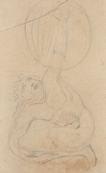 Editor: This is William Blake’s pencil drawing, "Los Supporting the Sun," from around 1793. It feels incredibly raw, like a quickly captured moment of intense effort. What do you make of it? Curator: The immediate visual echo I perceive is Atlas, burdened by the world. But consider this: Los is a character Blake invented. He represents the prophetic imagination, a creative force battling against reason and dogma. Editor: So the sun isn't literal? Curator: Perhaps not. What other symbolic weight could the sun carry? The 'sun' could represent enlightenment itself, or perhaps the oppressive weight of societal expectations and the established order. Notice how Los strains, almost pained, to hold it up. His effort embodies the struggle of artistic vision against a world that often resists it. Editor: That makes the raw, almost unfinished quality of the drawing even more powerful, as if the struggle is ongoing, never truly resolved. The lightning strikes that radiate outwards almost seem to threaten him. Curator: Exactly. Think about the emotional implications of light and darkness for Blake, a dichotomy which represents knowledge and ignorance. He deliberately uses Los to fight back against Enlightenment values of empiricism that repress the spiritual. He wants to give emotions dignity. How does it feel knowing this? Editor: That tension between reason and imagination definitely comes through now. It adds a layer of complexity. Curator: The power of visual symbols endures through art history, reminding us of how images crystallize both emotional and cultural truths. Blake invites us to delve into our own imaginations and support our own creative suns!