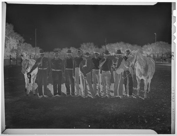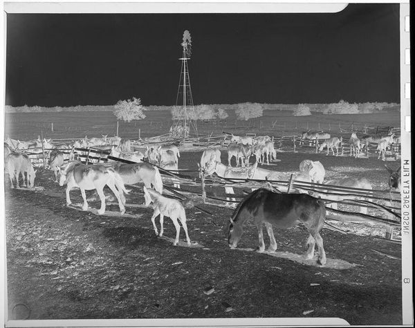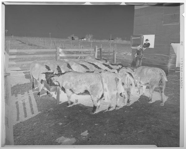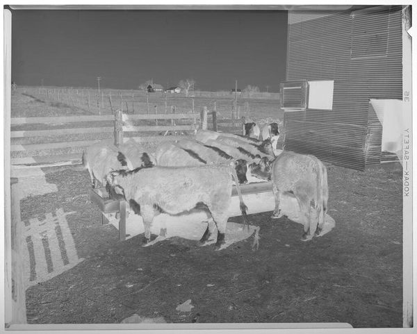 Curator: Here we have an untitled photograph by Harry Annas, currently residing in the Harvard Art Museums. It presents a gathering of cows in a field, captured in a seemingly simple, straightforward manner. Editor: There's a desolate sort of beauty to it. The sky presses down, almost suffocating, on this field filled with ghostly cows. It feels… lonely. Curator: The image, given its photographic nature, inherently speaks to the means of production. The gelatin silver process, the Kodak safety film, and the labor involved in documenting this agricultural scene invite considerations of material culture and photographic technology. Editor: Absolutely, but that bleak sky! It nearly eclipses the animals, turning them into mere shapes. It’s as though Annas is showing us not just cows, but the weight of the world. Curator: I agree, the composition certainly emphasizes the relationship between the environment and the animals, reflecting perhaps on industrial agriculture of the time. Editor: It does make you think, doesn’t it? Art isn't just about beauty; sometimes it's about feeling the stark reality of existence. Curator: Precisely, and examining the processes behind that starkness can enrich our understanding. Editor: Well, it certainly has given me a fresh appreciation for the humble cow!