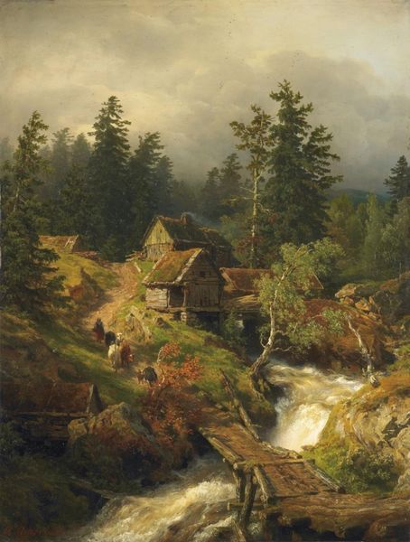 Amaldus Nielsen’s painting "Regnstemning, Rosendal" presents a landscape dominated by the colour green, giving an atmospheric representation of the region’s natural beauty. The composition is structured by a dynamic interplay between the flowing water and the solid mountain forms. Notice how Nielsen uses diagonal lines, from the lower right to upper left of the painting, to guide the viewer's eye through the scene. The artist employs tonal gradations to create depth and imbue the landscape with a soft, hazy quality that destabilizes fixed perspectives. The placement of the cabin and the figure is not merely representational but plays with spatial relationships. They invite a semiotic reading of the image, where the landscape acts as a signifier of nature's sublimity. This is less about a literal depiction and more about constructing an emotional and sensory experience. Nielsen challenges conventional landscape painting by emphasizing mood and atmosphere. The lack of precise detail encourages a more introspective engagement. The emotional ambiguity, combined with formal qualities of the work, invites endless re-interpretations.