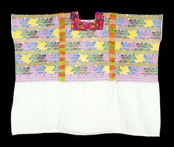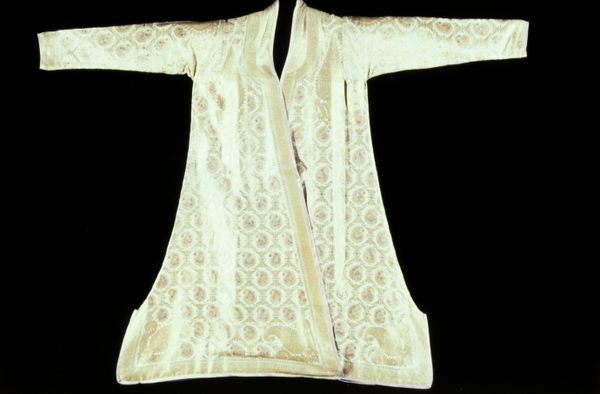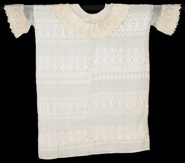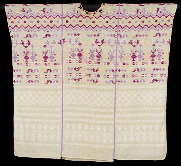 This Parsee Shirt is held at the Minneapolis Institute of Art. At first glance, this textile piece presents a symmetrical composition, dominated by a field of ornate floral patterns in soft hues. The structure of the shirt is articulated by a distinct V-neck and edged by vibrant magenta borders that offer a stark contrast to the subtle embroidery, immediately drawing the eye. The anonymous maker employed a dense, all-over pattern that challenges the viewer's perception of space and depth. The embroidery functions almost as a form of writing, encoding cultural values within its motifs. The visual elements, such as the repetition of floral forms and the strategic use of color, create a semiotic system through which the cultural identity of the Parsee community is subtly affirmed. The overall effect is a flattening of perspective that invites viewers to decode the shirt's intricate visual language. The shirt functions not merely as clothing, but also as a canvas for articulating and preserving cultural narratives.