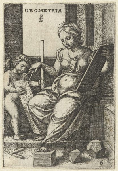 Editor: Here we have "Muziek," created by Georg Pencz between 1539 and 1543. It’s currently held here at the Rijksmuseum. The detailed line work gives the piece an allegorical feel. What do you see in this work? Curator: It's interesting to consider "Muziek" within its historical context. During the Renaissance, art often served to reinforce societal hierarchies. How might this image of a woman playing the organ be participating in or perhaps subverting those power dynamics? What does it mean for a woman to be depicted in the act of creating, rather than merely being the object of artistic creation? Editor: That's a really interesting angle. I hadn't thought about the agency the woman has in the piece. It does make you wonder about the intended audience and the message Pencz was trying to convey. Curator: Exactly. And think about the symbolic implications of music itself during that era. Was music seen as a purely aesthetic pursuit, or did it carry deeper connotations related to social status, religious devotion, or even political power? Is the putto beating time alluding to the education required to succeed? The score next to her on the organ and the scrolls by her foot suggest music involved formal study at the time. How accessible would such skills be for different groups within society? Editor: So, by exploring those questions, we can gain a better understanding of how this artwork functioned within the cultural landscape of the 16th century? Curator: Precisely. Art isn't created in a vacuum. Examining the social and political contexts is crucial for understanding its significance. Editor: I see it now, the power structures at play shape the interpretation! Thanks for opening my eyes to it. Curator: My pleasure. It's through these dialogues that we truly uncover the layers of meaning embedded within artworks.