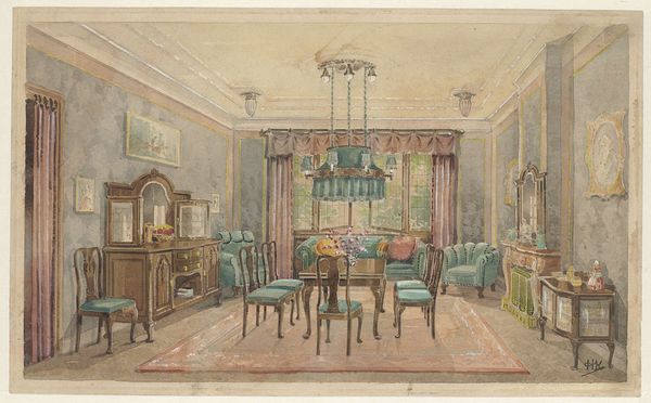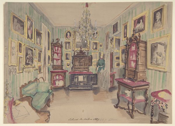 This watercolor drawing titled "Chambre à coucher" was made in 1857 by an anonymous artist. It depicts an intimate domestic interior, offering a glimpse into the cultural values of its time. The image creates meaning through the arrangement of furniture, personal possessions, and architectural details. Made in France, the room reflects the aesthetic preferences of the mid-19th century, where the emphasis on display and comfort reflects the rise of the middle class. The abundance of decorative objects suggests a culture that values refinement and personal expression, while the numerous framed artworks indicates a high cultural and social status. This connects with the institutional history of art collecting and display. To fully understand this artwork, a historian can use sources such as domestic records and design manuals. Only then it would be possible to illuminate how this artwork reflects the domestic life and cultural aspirations of its time.