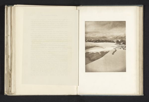 Curator: Let’s turn our attention to this evocative photograph, "Gezicht op een huis van een visser op de kust van Maine," or "View of a Fisherman's House on the Coast of Maine." It's a gelatin-silver print, created sometime before 1890 by an anonymous artist. Editor: My immediate impression is of a stark, quiet existence. The composition emphasizes a contrast between the rough, tangible structures of the fishing village and the hazy, almost ethereal expanse of the water. The delicate typography on the facing page suggests this piece is likely from a personal journal. Curator: Precisely. The gelatin-silver printing process allowed for finer details and tonal range, enabling a stylistic approach reminiscent of pictorialism, a movement embracing artistic effect. Notice how the textural nuances of the building and roughhewn lumber stand against the backdrop of the sea and sky. The homemade paper itself would also influence the final print. Editor: I am compelled by this stark portrayal. The muted tones emphasize the simplicity and potential harshness of life by the sea. The design is drawing my eye. The stylized text—the hand-drawn typeface across the page—feels intrinsically linked to the photograph's mood, grounding it in both the place and the time. The delicate typography reinforces a paperlike texture. Curator: It absolutely speaks to that. The lack of clear attribution invites us to consider the role of labor involved, the materiality of existence and its raw, unadorned essence as experienced and recorded within the immediate social context. Perhaps this piece intends to illustrate a humble daily existence, not to achieve "high art." Editor: Indeed. There's a raw honesty in how the elements are arranged, eschewing any pretense of idealization. We find ourselves observing a functional, lived space rendered in monochrome; there’s a delicate beauty that shines through. It’s less about documentation, more about a poetic interpretation of the real. Curator: Well, considering this work, it makes one pause to reflect on how photographic images are intrinsically linked to the materials that construct and give it meaning and form, offering insights into past lifeways, beyond what any surface glance can give. Editor: Ultimately, by appreciating its intrinsic forms, we see not only a place but sense a life – where its structure resonates deeply.