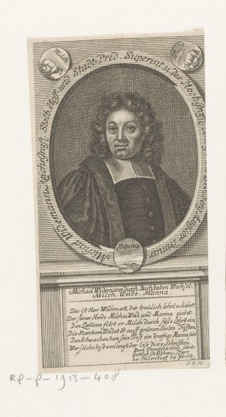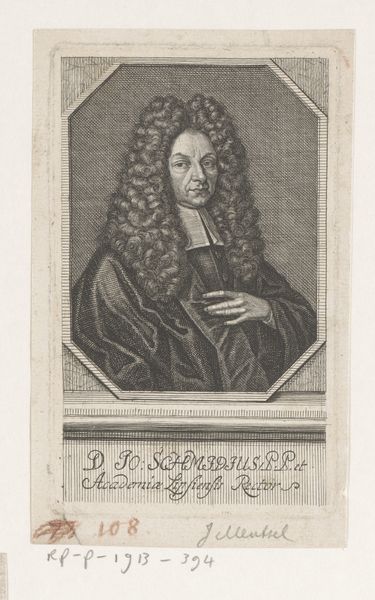 Editor: So, this is Johann Martin Bernigeroth’s 1735 engraving, "Portret van Jacob Friedrich Reimmann," housed here at the Rijksmuseum. It’s got a very formal, almost stoic quality to it. I'm curious, what are your thoughts on how it reflects the power dynamics of the era? Curator: This piece really speaks to the power structures inherent in Baroque portraiture. How does Bernigeroth’s rendering reinforce Reimmann's societal position, considering his roles as superintendent and gymnasium ephor? Does the printmaking medium, with its capacity for replication, democratize the image, or does it primarily circulate within elite circles? Editor: That's a great question! On the one hand, it reproduces easily. But access to prints wasn't necessarily widespread, was it? It was still somewhat exclusive, wasn’t it? Curator: Precisely. And how do you interpret the gaze? Is it inviting, confrontational, or something else entirely? Considering the historical context and Reimmann's profession, might his look be projecting authority, perhaps even moral superiority, aligned with the dominant religious and intellectual norms of the time? Editor: I think you’re right; it’s definitely not inviting! He’s giving a very “judgey” vibe. So, while seemingly accessible due to the medium, it actually reinforces social hierarchies through its subject and visual language. That’s… sobering. Curator: Indeed. Reflecting on the print’s function, does it perpetuate or challenge existing power dynamics? Considering the role of religious figures during the Enlightenment, and the complex relationship between knowledge, power, and control, how do you think we can read it today? Editor: I hadn’t thought about it that way. It highlights the subject's status, definitely, but also the engraver's skill in immortalizing and distributing that image of power. Thank you! Curator: And I appreciate you pointing out the inherent tension between the reproduction method and its limitations regarding its dissemination within the 18th century society. Food for thought!