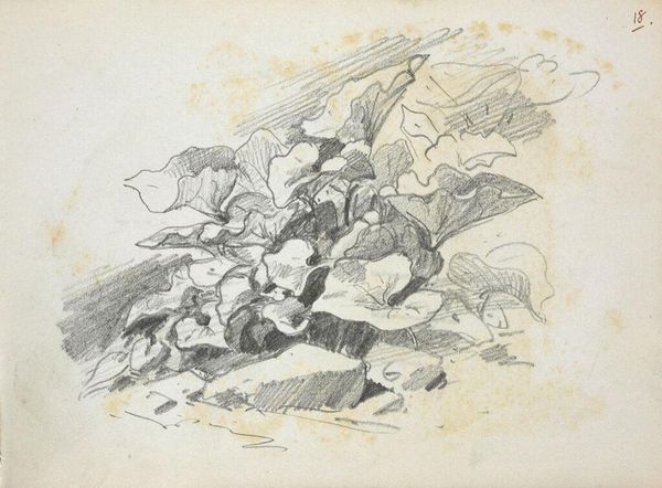 Curator: Charles Herbert, born in 1829, gave us this quiet watercolor called "Mullen and Rocks," and it feels like a secret world captured on paper. Editor: It gives the impression of being in a secluded, forgotten place, almost dreamlike. The muted palette creates an atmosphere that is both calming and melancholic. Curator: Right? There's a tender beauty, but also a hint of impermanence. Think about what's *not* there—no figures, no grand narrative, just the humble interplay of plant and stone. Makes you wonder about our relationship to nature, doesn't it? Editor: Absolutely. We can think of the mullein here as a symbol of resilience, perhaps of nature's resistance to the structures, both natural and constructed, that seek to confine or define it. Curator: I love that—the mullein stubbornly asserting its life against the rocks' silent authority. Makes you think about all those quiet battles for survival and recognition happening all around us, all the time. Editor: Yes, like a microcosm of larger power dynamics. It really makes you appreciate how a seemingly simple image can actually provoke some powerful reflections. Curator: Exactly. I’ll never look at a roadside weed quite the same way again. Editor: Me neither. It offers a very particular lens through which we can reflect on nature and our place within its systems.