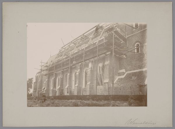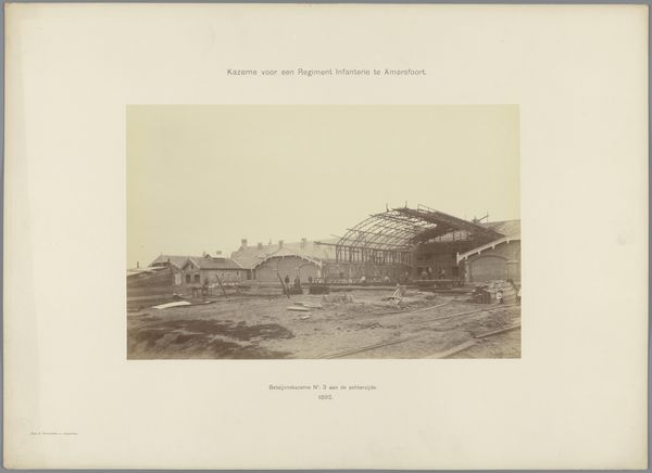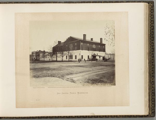 Editor: This is Timothy O'Sullivan's photograph, "View of the Petersburg Gas Works." The tones are quite muted, almost monochromatic. What strikes you about the visual composition? Curator: The photograph presents a fascinating study in contrasts: the rigid geometry of the industrial architecture against the organic, seemingly untamed, foreground. The interplay of light and shadow emphasizes the stark materiality of the buildings. Editor: The way you put it really changes my perspective on how I see this photograph. Curator: Indeed. The photographer seems to have sought out the formal qualities inherent within this juxtaposition. What new insights did this offer you? Editor: How the buildings’ geometry contrasts with the untamed foreground elements. Thank you for sharing your perspective.