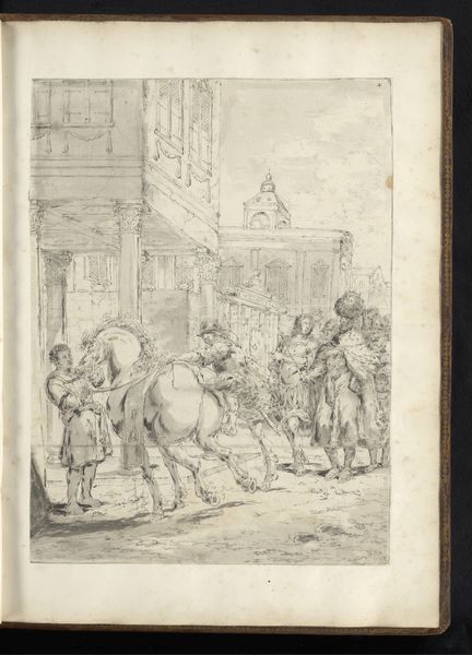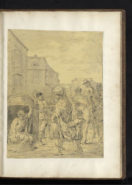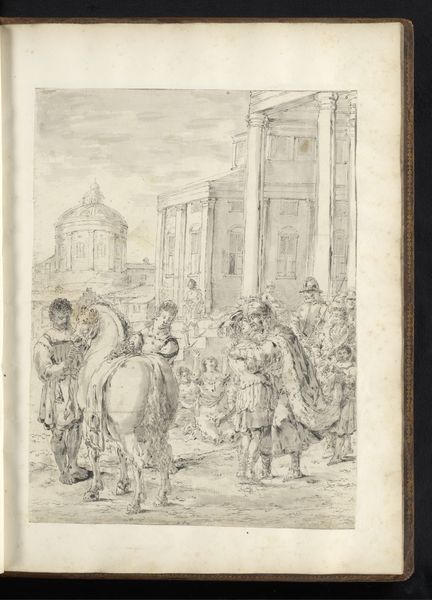Curator: Leonaert Bramer's drawing, created circa 1655 to 1665, is titled "Alexander the Great Visiting the Temple of Jupiter." It’s currently held at the Rijksmuseum, rendered in ink on paper. The baroque style provides an evocative look at the ancient world. What are your first thoughts? Editor: The sepia tones lend it an immediate sense of age. The temple setting feels almost like a stage, and Alexander—materially represented—appears somewhat diminutive within the overall composition. Curator: Right. Let's unpack this stage, as you call it. Bramer places Alexander within a highly theatrical setting. The bishop-like figure’s raised hand gesture, alongside the architectural backdrop, lends the piece to baroque theatricality—a lens that was employed often in art that depicts leadership. Is this grand welcome genuine? Or, perhaps, is it forced? Editor: Forced, perhaps. What stands out to me is the execution of the figures themselves. Bramer employs economical lines to suggest texture, from the bishop’s robes to Alexander's cloak. This approach draws attention to the craft of creating this illusion of wealth and power, right? The use of basic materials underlines the artifice. Curator: That resonates. This historical rendering serves as a prompt to interrogate constructions of power. Alexander's historical significance allows us to examine representations of masculine leadership. The setting also begs the question, how does a figure use a higher power such as religion to gain popularity, power and validity. Editor: Indeed. I'm particularly drawn to the immediacy of the drawing. One can almost sense the artist working with simple tools. It grounds the image in a real process of material creation that mirrors Alexander’s attempts to make real his empire through tangible conquests and material achievements. Curator: Ultimately, this image reveals much about how power dynamics function across various strata of society through the ages. Editor: Absolutely. Examining both the artist's means and Alexander's, reveals power as performance. Curator: That intersection reveals more than expected, then. Editor: It does, highlighting the way the materials reflect history, and vice versa.
