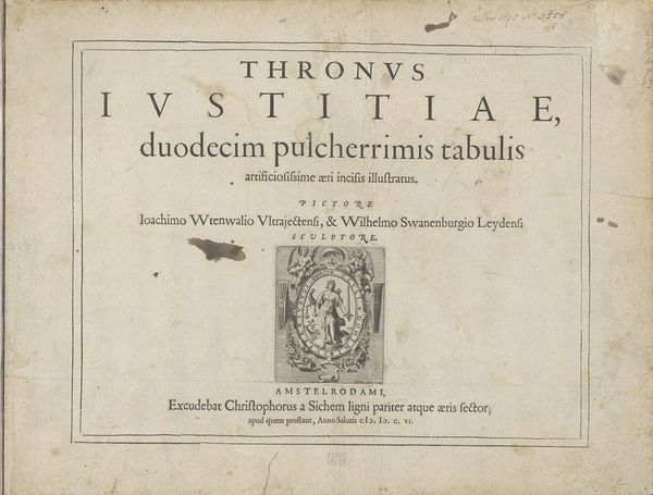 Curator: Here we have an illustration from Franciscus Gratiano de Garzatoribus’ Institutionum Iuris Civilis, printed in Venice in 1575. The lettering and ornate border immediately strike me. Editor: Yes, it’s the layout that first captures my attention, too. The way the dense text interacts with the symbolic vignette below gives it such a strong visual weight. What can you tell me about the means of production for such an item? Curator: Well, the crispness of the lines suggests woodcut or engraving. The texture of the paper also speaks to me. The process, undoubtedly laborious, adds to its inherent value. Editor: I find myself thinking of the printer, Christopher Zanetti, and the historical context. What was it like to be crafting these legal texts at that moment in Venice? Curator: Indeed, the confluence of law, craftsmanship, and design offers much to contemplate. Editor: Absolutely. It's more than just ink on paper; it's a tangible piece of social history.