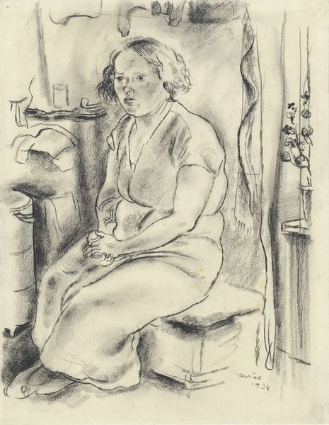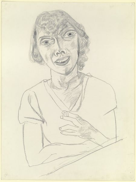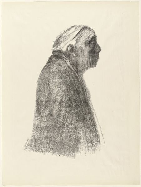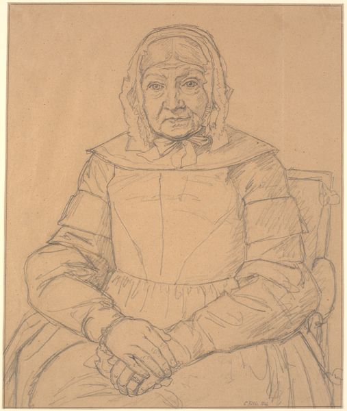 Curator: Looking at Maggi Hambling’s "Study for Portrait of Frances Rose," I’m struck by the sitter's direct gaze. It has a quiet intensity. Editor: Yes, the sharp charcoal rendering is arresting, giving it a raw, immediate feel. What do you make of her hands? Curator: The hands suggest a life of work. Hands are often a signifier of the soul, bearing witness to memories, experiences, and even hardships of a life lived. Editor: There's a very poignant kind of social realism in Hambling's choice of subject. How does this artwork reflect the times and concerns of its socio-political context? Curator: The image evokes archetypes of resilience, capturing a timeless quality of aging and experience. There's a universal feeling of dignity. Editor: I agree. It really humanizes Frances Rose, challenging stereotypical representations of older women. Curator: In short, I think we witness here the artist's capacity to reveal the inner self in her subjects. Editor: And to engage with ideas about representation in the field of portraiture. It leaves you pondering.