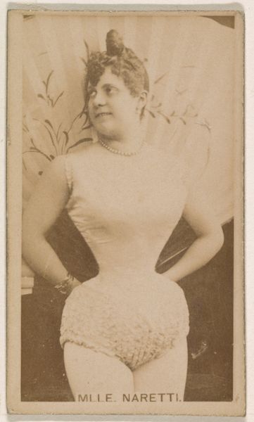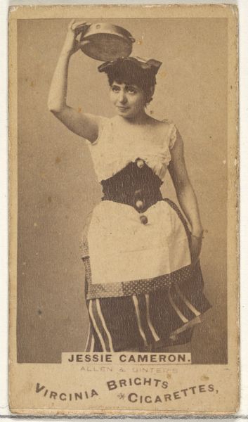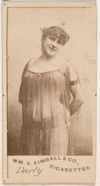 Editor: So, here we have "[Actress standing with hand on hip]" from around 1890-1895 by W. Duke, Sons & Co., it's a photographic print used for cigarette cards. What a cool artifact! I’m curious – the actress seems to be playing a male role, or at least dressing in very non-feminine attire of the era. What can we unpack from that? Curator: Excellent observation! It’s fascinating how clothing carries symbolic weight, isn’t it? While the surface shows us a woman in costume, consider the cultural context. Actresses frequently played male roles on stage. Think about what that signals – challenging gender norms, blurring lines. What kind of emotional impact might that have on the audiences of that time? Editor: I guess it could be subversive, showing women in positions of power even if it's just pretend. Is that what made these cards so popular? Curator: Precisely! Popular culture is never just innocent entertainment. It's a stage where societal anxieties and desires play out. The "masculine" attire--the implied sword or dagger on her hip, for instance--doesn't necessarily empower her in the sense we would understand it today. It places her within a pre-established framework of idealized heroes and performative strength that was, at the time, a traditionally male domain. Can you see hints of Japonisme here, too, influencing the presentation of the figure? Editor: Oh, yeah! Now that you mention it, the almost flattened perspective and theatricality give me a sense of Japanese woodblock prints, in a way. Curator: And think about the intimate scale of a cigarette card. These images weren't meant to be displayed grandly, but consumed privately. What sort of fantasies or role play might they have facilitated? Editor: Wow, I didn’t think there were so many layers to explore within one little card! Curator: Exactly! An image is never just an image; it's a mirror reflecting culture. Editor: I'll never look at these cards the same way again. Thanks!