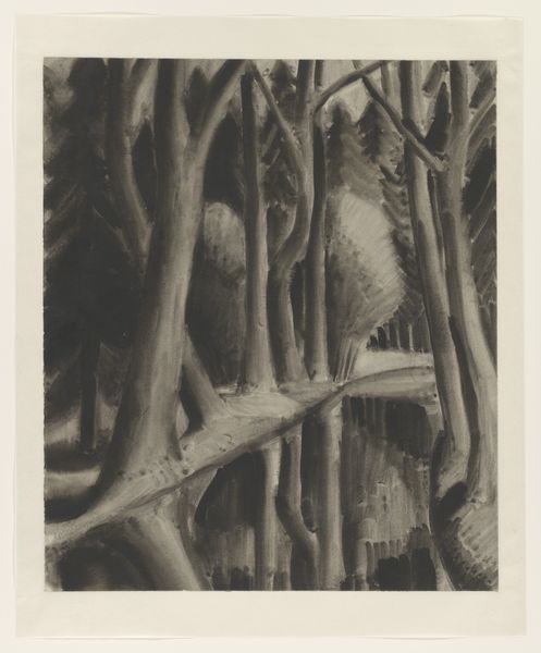 Editor: Here we have "The Dancing Trees," a 1922 print by Alfred Stieglitz, currently residing at the Art Institute of Chicago. It’s a photographic image with strikingly high contrast; I find the close-up view almost abstract, disrupting my sense of depth. How do you approach its interpretation? Curator: Note the almost tactile quality achieved through Stieglitz's control of light and shadow. Consider how the sharply defined tree trunks and the softer focus of the background grass create visual tension. This play with focus and the meticulous arrangement of lines, how would you say these forms guide our eye? Editor: I guess they direct my eye in a series of diagonals—from the lower left to the upper right. Is that considered a dynamic composition? Curator: Precisely. Dynamic not just in composition but in the textures evoked, isn't it? The smoothness of the bark, contrasted with the hazy background… Stieglitz has captured a visual experience and elevated it to the realm of formal exploration, highlighting the medium's potential. Editor: It's fascinating how he uses photography to play with form, almost challenging its representational role. I was thinking, do you see any ties to Pictorialism beyond just subject and medium? Curator: Yes, certainly! Look at the tonality and the manipulation of the print to create a softened, almost painterly effect. Stieglitz is using photographic techniques to evoke the aesthetics of painting. Observe how he coaxes the image towards an idea instead of only capturing what's there. Editor: I never considered how the blurring could serve an aesthetic purpose in itself! Thanks. I'm looking at this photography in a totally different way now! Curator: Indeed. And that exploration of visuality remains as stimulating today.
