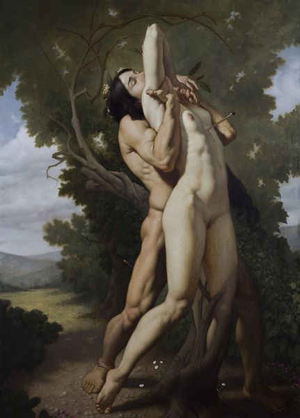 Curator: This is Roberto Ferri's "Sogno Di Rugiada," created in 2020. At first glance, what strikes you about it? Editor: The sheer muscularity, undeniably. It's a ballet of weight and counterweight, of contrasting yet strangely complementary forms. The subdued palette lends the piece a gravity that echoes historical works, perhaps those of the Baroque era. Curator: Yes, Ferri often employs techniques reminiscent of the Baroque masters. Consider how the bodies are rendered. It highlights the artist's skillful application of oil paint to achieve a near-sculptural definition of the human form. What do you think about the process? Editor: Absolutely. I notice in Ferri’s use of glazing and layering techniques, how light subtly plays across their skin. This gives the figures volume, highlighting the material's capacity to evoke realistic textures and shapes. However, the almost surreal juxtaposition disrupts the familiar. Curator: Indeed, and looking beyond just what we see, to the social and economic contexts of its creation is essential. Ferri operates within a global art market that, while valuing individual skill, is deeply entwined with historical representations of the body, challenging and reshaping these classical notions for a modern audience. Editor: That said, there’s undeniable eroticism—a subtle charge—but also this element of religious symbolism, most evident with the female figure's halo. I'm very curious as to the meanings behind those signs... Curator: Consider that through "Sogno Di Rugiada," Ferri places his contemporary subjects within a dialogue with canonical artworks. The canvas becomes a site where tradition meets present-day anxieties, and the production itself mirrors art-historical lineage. Editor: Thank you for this context, I was indeed captivated by this dance of the present and the historical. This work exemplifies how form and material interplay in communicating tension, fragility, and physical strength. Curator: Ultimately, through studying this image we understand art as more than representation—instead an artifact imbued with traces of its time and the processes involved in its making. Editor: In all, this close looking provides rich insight—from purely visual interpretation to questions regarding how technique, influence and symbolic language shape the artist's practice and what their art ultimately conveys.