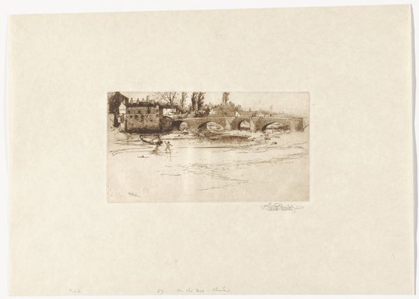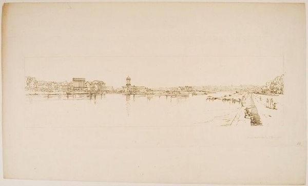 Editor: This is David Young Cameron's "Lunan Bay," an etching from 1911. There's a striking stillness to this landscape, a quiet drama. How do you interpret this work? Curator: The scene whispers of the precarious relationship between humanity and nature, doesn’t it? Etchings like this, particularly those capturing landscapes, often romanticize rural life while subtly acknowledging the social and economic transformations occurring. Consider the depopulation of rural areas during this time, driven by industrialization. How does the artist frame that narrative, if at all? Editor: I hadn’t considered that aspect. The figures are so small, almost swallowed by the landscape. Perhaps they symbolize the individual's vulnerability in the face of larger forces? Curator: Precisely. Think about the compositional choices. The low horizon line, the vast expanse of the bay— what effect does that create for the viewer? Does it amplify or diminish our perception of the buildings? How do elements like the boats contribute to this story? Are they symbols of trade and connection, or evidence of reliance and struggle? Editor: I see your point. The muted tones almost seem to neutralize the scene, avoiding stark judgements. It prompts reflection more than anything else. Curator: It allows for multiple readings. It asks us to examine the layered realities of a place—the beauty, the history, and the social complexities woven into it. It also encourages a deeper look into our own contemporary understanding of rural communities, displacement, and the ongoing dialogues surrounding land, ownership, and identity. Editor: That’s a very insightful way to look at it. I now have a greater appreciation for how art can reflect complex societal issues. Curator: Absolutely. Art acts as a mirror, reflecting not just what we see but also prompting us to examine who we are and what narratives shape our world.