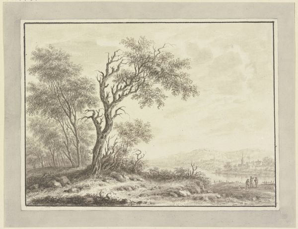 Editor: We are looking at "Landscape," an etching and engraving by Jean-Baptiste-Claude Chatelain, dating from about 1725 to 1763. The monochromatic palette and delicate lines create such a tranquil, almost dreamlike atmosphere. What stands out to you? Curator: The use of line, of course, is paramount. Notice how the artist employs varying densities of hatching and cross-hatching, not just to depict light and shadow, but also to define the very textures of the trees and the distant architectural structures. Editor: It’s fascinating how those simple lines evoke such detail! Curator: Indeed. The composition also merits consideration. The strong verticals of the trees create a sense of stability. Yet, contrast this with the subtle recession into space, guided by the diminishing scale of the buildings. Do you see how that linearity directs our gaze? Editor: Absolutely. The lines almost seem to choreograph the viewer's eye through the landscape. It feels balanced, yet with an intentional asymmetry. Curator: Precisely. This delicate balancing act demonstrates the artist's sophisticated manipulation of formal elements. One must also consider the negative space...Observe how it both defines and enhances the represented forms. Do you agree? Editor: I do. It makes the work breathe, prevents it from feeling cramped despite all the fine detail. Curator: Yes, it allows for an almost lyrical reading of the artwork. Overall, through analyzing the intrinsic visual elements we get an elevated appreciation for Chatelain's printmaking skills. Editor: I agree. Focusing on the line work, composition, and form has really enriched my understanding of the image and allowed me to see so much that I didn't notice at first.
