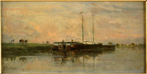 Charles-François Daubigny made this painting, The Barges, using oils on canvas, a material and method central to 19th-century art. Daubigny’s technique, however, was distinct. The way he applied the paint, in loose, visible strokes, makes the scene look spontaneous, as if captured in a fleeting moment. Look closely, and you'll see how the brushwork creates texture, especially in the reflection of the water. This focus on the materiality of paint itself, rather than illusionism, was a hallmark of his work. Living on a boat for a significant amount of time, Daubigny observed the lives of working-class communities along the river Oise. Barges, a work that portrays the realities of river life, is a reflection of the changing economic landscape and increasing industrialization of France. By emphasizing the materials and processes of painting, and drawing attention to everyday life, Daubigny challenges traditional artistic boundaries, elevating the ordinary into something truly remarkable.