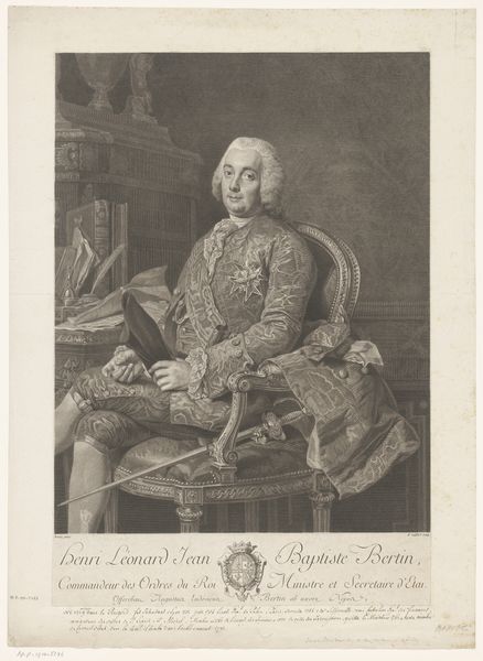 Editor: Here we have James McArdell's "Portret van Frederik de Grote," an engraving from around 1745-1765. It strikes me as very formal and…stiff, almost like a propaganda piece. What do you see in this work beyond the immediate impression of power? Curator: It's easy to see it as mere propaganda, but let's consider the context. This portrait emerges during the Enlightenment, a period of evolving ideas about leadership and representation. How might Frederick the Great, known for his military prowess and intellectual pursuits, be attempting to craft a specific image? What tensions do you see between the display of aristocratic power and the burgeoning ideals of the Enlightenment in his posture and gaze? Editor: I hadn't thought about the Enlightenment aspect so directly. I guess he’s trying to balance looking like a traditional monarch and an intellectual, which maybe explains the slightly awkward feel of the portrait? But wasn’t Frederick also known for his militarism? Doesn’t that contribute to the reading of him as a figure of power above all? Curator: Precisely. The baton in his hand is not just an accessory, but a potent symbol of his military command. We should question, though, what message McArdell, as the engraver, is reinforcing or perhaps even subtly undermining. Is he simply reproducing an image of power, or is there a critique embedded in the very act of representation? Consider the role of printmaking during this period in disseminating images and shaping public opinion. How does the medium itself contribute to the message? Editor: So it’s not just *what* is shown but *how* and *why* it’s being shown in this specific medium? The print makes it reproducible, which implies wide dissemination, shaping of public opinion… almost like early social media. It gives agency to McArdell as the engraver and as a result complicates this idea of simple, straightforward propaganda. Curator: Absolutely. By thinking intersectionally - considering the historical, social, and artistic contexts – we gain a far richer understanding of this portrait beyond its surface representation. Editor: I’m definitely seeing this portrait in a new, more nuanced light now. Thanks for sharing your insights.