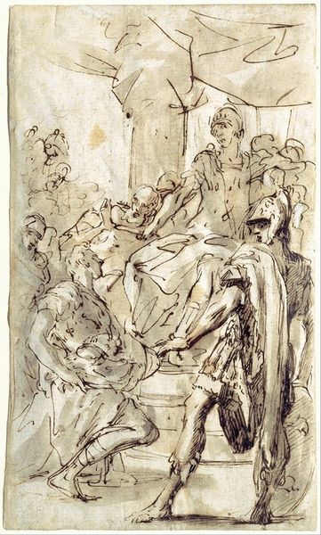Editor: Here we have an intaglio drawing from sometime between 1675 and 1800. It’s called "The Holy Family with Sts Anne and Joachim (?)," and it's attributed to an anonymous artist. It definitely gives off a Baroque vibe. I am struck by how ephemeral it feels because of the open linework and ink wash. What do you make of it? Curator: Well, the 'feel' is a great starting point, isn't it? I like how the artist seems to be searching for the forms, those fleeting gestures defining something sacred, familiar but perhaps just beyond reach... Tell me, does that sense of searching—of *not quite* arriving—detract from the work for you, or does it, perhaps, add to its emotional impact? The incompleteness almost enhances the tender interaction, wouldn't you say? Editor: I think it does. If it were more polished, it might feel a bit stiff or overly sentimental. Curator: Exactly! And beyond the feel, have you noticed the dynamism implied by the composition, the implied diagonals, and that theatrical use of light and shadow—even in monochrome? These elements lift it beyond a simple genre scene into something...well, more evocative. Almost as if it were a memory itself. Editor: That’s true, it does. So, even with the uncertainty of the artist's identity, or even the sitters, the work can still offer something profound. Curator: Absolutely. Sometimes, it's the questions, the ‘maybes,’ that keep us looking and wondering and, ultimately, connecting with a piece. What did we learn about seeing the humanity in it? Editor: How the beauty often resides in the subtle details of the overall atmosphere of it. Curator: Yes! Maybe, and just maybe that question mark lets in the real light!