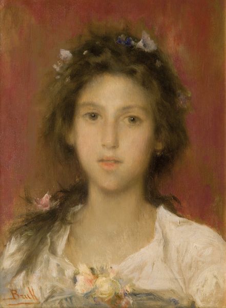 Editor: So, this is John William Waterhouse’s "Portrait of Miss Claire Kenworthy," painted in 1900 with oil on canvas. The subdued colours create a sense of quiet introspection, and I find the sitter’s gaze somewhat melancholic. What do you see in this piece? Curator: Well, considering Waterhouse's known fascination with mythological and literary women, this portrait presents an intriguing departure, yet one still deeply embedded in the art world of its time. Look at how Miss Kenworthy is presented – what does her clothing and pose communicate? Editor: I see that she wears a simple white dress with a scarlet ribbon, which stands in contrast to many other formal portraits of the time. Her hands are clasped and it is pretty informal… maybe meant to be viewed as “natural”? Curator: Precisely! This reflects a shift happening at the turn of the century. High society women were not solely defined by the rigid dictates of the salon, they could embrace a newfound informality. This painting serves not only as a representation of the sitter but as a projection of cultural values evolving. The redness of the sash, it adds visual interest and directs us, is she announcing herself to the establishment by being her own woman? Editor: So, even something seemingly simple as the subject’s pose, attire and the artist’s composition would reflect broader societal changes. How fascinating! Curator: Absolutely! And thinking further, a portrait like this also functioned within a market. Who was commissioning these types of works and why? Exploring these aspects opens new doors into understanding art's place within a specific historical and economic context. Editor: That makes me consider that Waterhouse's other paintings with literary heroines made them so famous, perhaps also served to construct an idea of women! I’ll keep that in mind from now on!