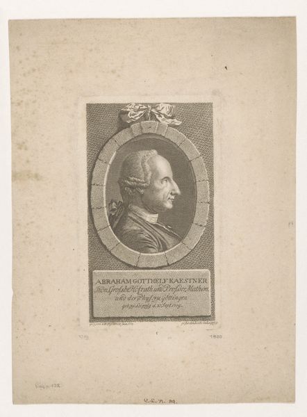 This is Carl Christian Glassbach’s portrait of Franz Balthasar Schönberg von Brenkenhoff, rendered as an etching. The composition is dominated by an oval frame encircling the portrait, immediately drawing our attention to the subject. This frame, adorned with a ribbon at the top and a coat of arms below, functions as a structured border, typical of formal portraiture, to contain and present its subject within a defined social context. The subject is further stabilized and made to mean something specific. Glassbach’s choice of etching, with its capacity for fine, controlled lines, allows for a detailed depiction of textures and facial features. The meticulous line work builds up tonal contrasts that model the face and clothing, giving a tactile quality to the image. Such detail emphasizes realism and perhaps alludes to Enlightenment values of precision and observation. This etching not only captures a likeness but also encodes a network of social and cultural meanings about status, identity, and the representation of self.