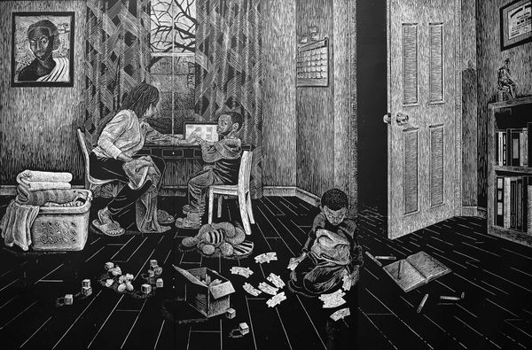 Curator: Looking at this drawing, I feel like I’m stepping into a memory, a nostalgic snapshot of childhood. Editor: This drawing, crafted by Sigurd Wandel between 1912 and 1913, is titled "Interiør med to legende børn," or "Interior with two playing children" in English. Wandel used charcoal and pencil on paper to create this genre scene, and the work is currently held here at the SMK. Curator: It's the light that really grabs me. The sunbeams filtering through the windows aren’t just illumination; they’re almost a divine presence watching over these children. Notice how the room is rendered. The light fills it. It gives the scene such depth. Editor: Precisely, light carries complex symbolism! The domestic space, bathed in ethereal light, evokes ideas about innocence, domesticity, and the sanctity of childhood—an interesting notion particularly prominent in the early 20th century when social reforms focused increasingly on children's welfare and their protection. Curator: You can see it not just as sentimentality but also as an engagement with contemporary ideals. The home itself, especially within the Danish Golden Age tradition which valued scenes of quiet domesticity as emblems of national identity and cultural stability, could represent society's values. Editor: I agree, though one cannot overlook that there seems to be some other aspect of visual culture and memory here. Children, in general, have been visual emblems for vulnerability, purity, and hope—ideas universally resonant, giving an allegorical, timeless layer to genre paintings depicting such moments. This can tell a larger story about memory and about our hopes and fears as a society. Curator: Thinking about it within the context of art institutions like SMK, where it resides today, we see how the selection, preservation, and display of works contribute to defining what a culture deems worthy of remembering, valuing, and presenting to future generations. What seems personal then gains a social relevance. Editor: Indeed! And considered symbolically, it can bring new appreciation to Wandel's beautiful composition. Curator: Seeing "Interiør med to legende børn" gives you pause and perhaps to question what you bring to these kinds of seemingly simple pieces of our shared artistic patrimony. Editor: I agree. Viewing it through an iconographic lens, or an historical one, deepens the artwork’s meaning to each of us in our own contemporary society.