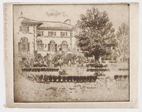 Editor: This is Sears Gallagher’s “Saint Paul’s Cathedral, Boston.” It feels like a fleeting moment captured in time. What strikes you about this print? Curator: I see a dance between permanence and ephemerality. The Cathedral, a symbol of enduring faith, is softened by the hazy light and the almost ghostly figures passing by. It's like Gallagher is reminding us that even the most steadfast things are subject to the flow of time. Does it evoke a certain nostalgia for you? Editor: It does. It makes me think about how cities are constantly changing. Curator: Exactly! And how art helps us freeze those moments, like a whisper from the past.